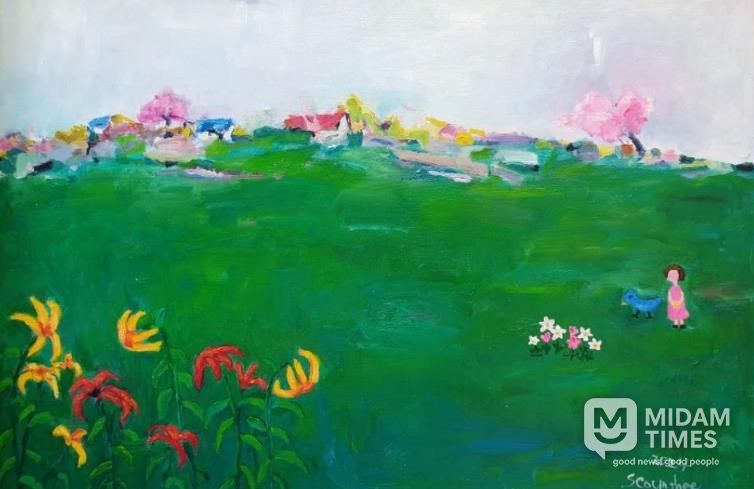 김성희 작가는 들풀들이 만든 푸른 빛 벌판 사이 형형색색의 꽃과 사람을 함께 그려 넣었고, 별처럼 빛나는 꽃들 사이에 숨어 있는 파랑새를 통해 우연히 만나는 행복을 표현했다.