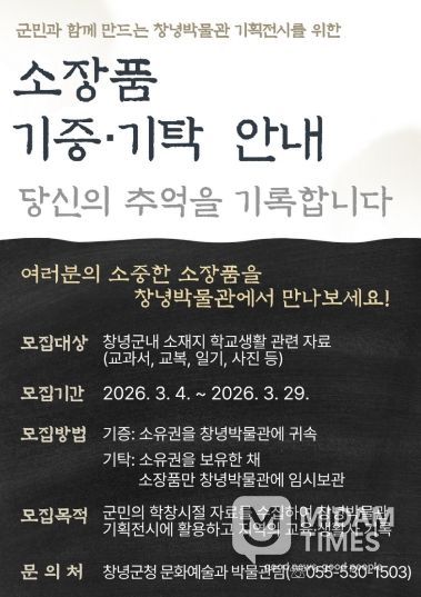 소장품 모집 기간은 3월 4일부터 3월 29일까지이며, 참여를 희망하는 군민은 기증 또는 기탁의 방식으로 창녕박물관에 접수하면 된다.
