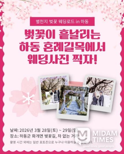 미담타임스 황명수 기자 | 하동군은 오는 3월 27일부터 29일까지 열리는 ‘제27회 화개장터 벚꽃축제’를 앞두고, 특별한 웨딩 촬영 이벤트의 참가 신청을 받는다고 밝혔다.