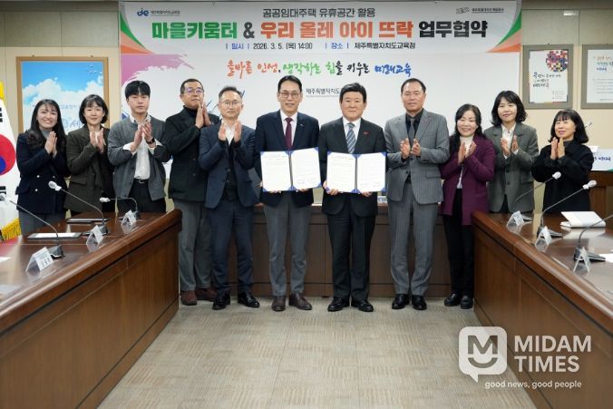 미담타임스 박민정 기자 | 제주특별자치도교육청은 제주특별자치도개발공사와 5일 도교육청 상황실에서 공공임대주택 유휴공간을 활용한 ‘우리 올레 아이 뜨락’ 사업과 도교육청 ‘2026 마을키움터 운영’ 사업의 상호 협력을 위한 업무협약을 체결했다.