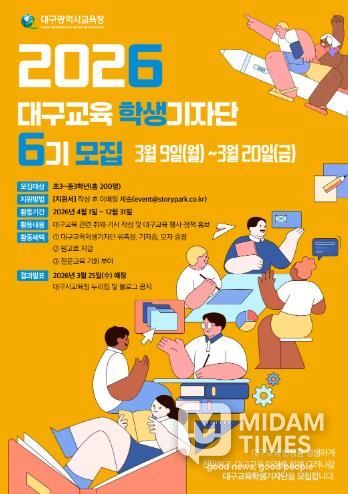 미담타임스 전해찬 기자 | 대구시교육청은 3월 9일부터 20일까지 2주간 대구교육의 주요 정책과 각종 소식을 생동감 있게 전하는 대구교육의 홍보대사 역할을 할‘2026년 대구교육기자단’을 모집한다고 밝혔다.