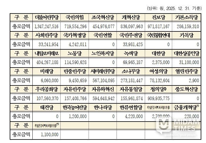 미담타임스 공한별 기자 | 중앙선거관리위원회는 2025년도 중앙당후원회와 국회의원후원회의 후원금 모금내역을 집계한 결과, 37개의 중앙당(중앙당창당준비위원회 포함)후원회가 총 81억 7천8백여만 원을, 303개의 국회의원후원회가 총 608억 3천2백여만 원을 모금했다고 밝혔다.