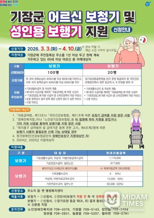 지원 대상은 2026년 3월 3일 기준, 기장군에 주민등록상 주소를 두고 1년 이상 계속 거주하고 있는 65세 이상 어르신이다. 품목별 신청 자격을 충족해야 하며, 보청기나 성인용 보행기를 법령 또는 다른 지원사업을 통해 이미 지원받은 경우에는 대상에서 제외된다.