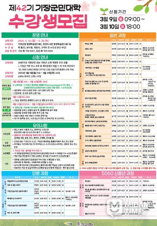 미담타임스 남혜영 기자 | 기장군은 오는 9일부터 10일까지 2일간 ‘2026년 제1기 평생학습강좌(기장군민대학·기장군민어학당) 수강생을 모집한다고 6일 밝혔다.