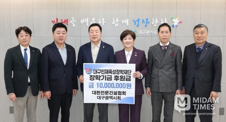 미담타임스 남혜영 기자 | 대구시교육청은 3월 5일 대한전문건설협회 대구광역시회가 장학금 1천만원을 대구인재육성장학재단에 기탁했다고 밝혔다.