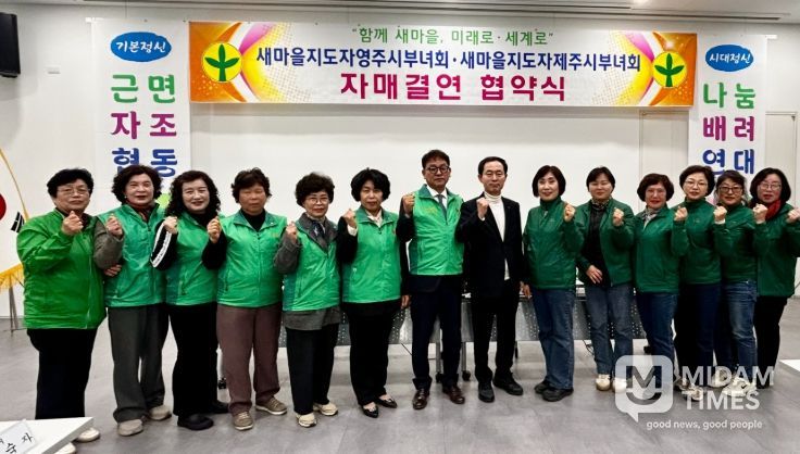 미담타임스 김준완 기자 | 새마을지도자영주시부녀회(회장 정경자)는 지난 6일, 새마을선비회관 2층 강당에서 새마을지도자제주시부녀회(회장 강길선)와 문화·관광 분야 활성화와 지역 간 농특산물 직거래 확대 등을 위한 자매결연 협약(MOU)을 체결했다.