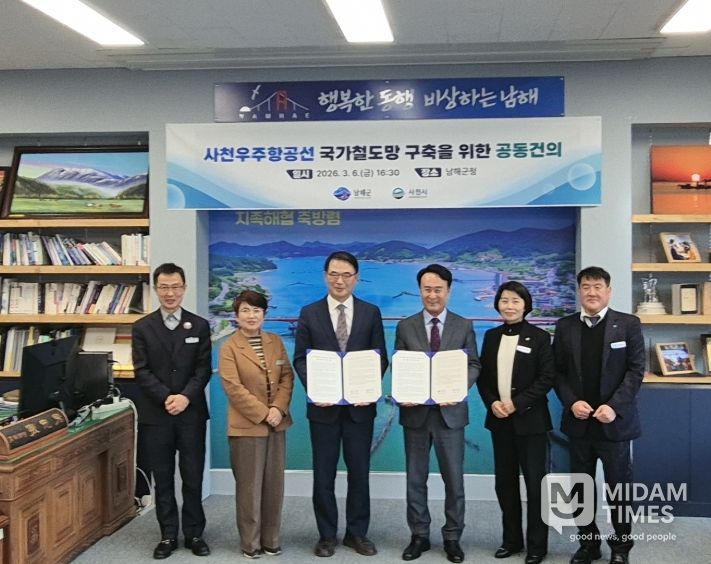 사천시와 남해군은 3월 6일 남해군수실에서 ‘사천우주항공선 국가철도망 구축’을 위한 공동 건의문을 채택하고 국토교통부에 제5차(2026~2035) 국가철도망 구축계획 반영을 공식 요청할 계획이다.