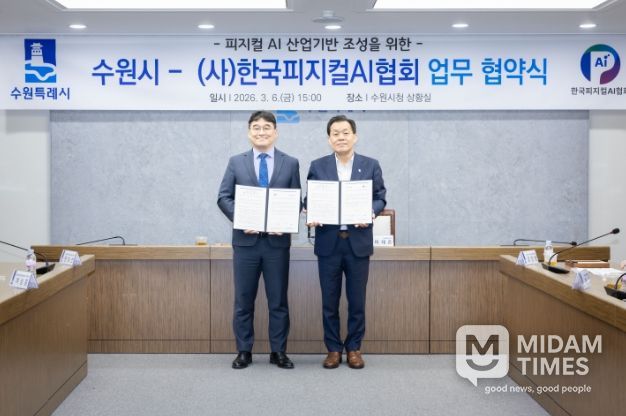미담타임스 정주환 기자 | 수원특례시와 (사)한국피지컬에이아이(AI)협회는 6일 시청 상황실에서 업무협약을 체결하고, 피지컬 인공지능(AI) 산업 활성화를 위해 적극적으로 협력하기로 했다.