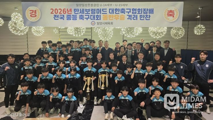 미담타임스 황명수 기자 | 밀양시체육회는 지난 6일 밀양아리나호텔에서 ‘2026 만세보령머드 대한축구협회장배 전국 중등 축구대회’에서 동반 우승을 차지한 밀양·밀성풋볼 스포츠클럽(U-15, U-14) 선수단을 격려하기 위한 축하 만찬을 개최했다고 밝혔다.
