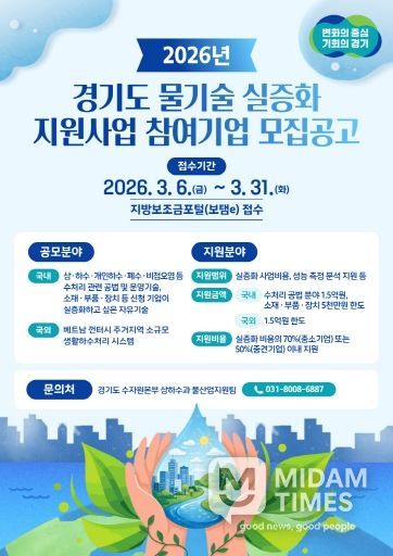 미담타임스 김준완 기자 | 경기도가 ‘2026년 경기도 물기술 실증화 지원사업’ 참여 기업을 공개 모집한다.