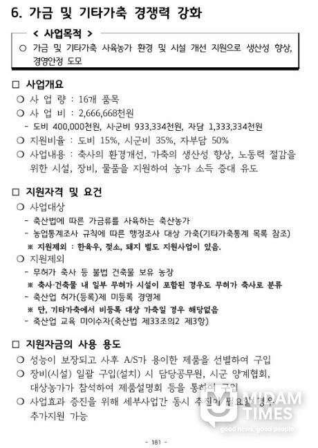 ‘가금 및 기타가축 사육농가 지원사업’은 시설 현대화를 통한 축사 환경 개선, 방역 물품 지원 등을 통한 생산성 향상이 주요 내용이다.
