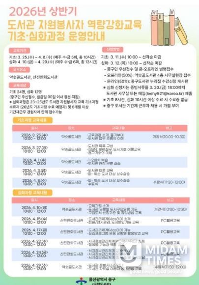 미담타임스 김준완 기자 | 울산 중구가 도서관 운영을 활성화하고 자원봉사 문화를 확산하기 위해 ‘2026년 상반기 도서관 자원봉사자 역량 강화 교육’을 운영한다.