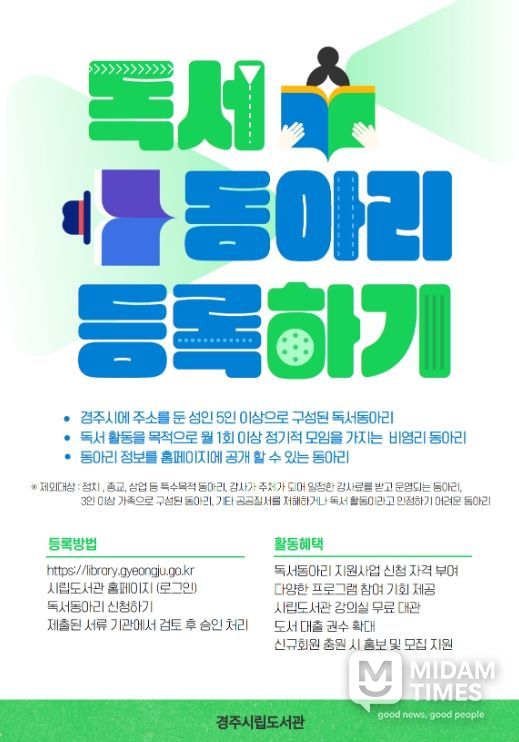 미담타임스 김준완 기자 | 경주시는 독서문화를 확산과 지역 내 독서모임 활동 지원을 위해 ‘독서동아리 등록제’를 연중 운영한다고 10일 밝혔다.