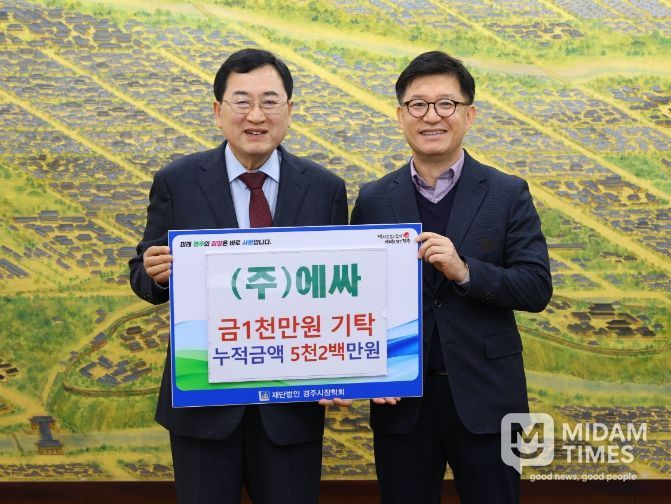 미담타임스 김준완 기자 | 수처리 전문기업 ㈜에싸가 미래 경주지역을 이끌어 갈 인재 육성과 지역 교육 발전을 위해 장학금 1천만 원을 (재)경주시장학회에 기탁했다.