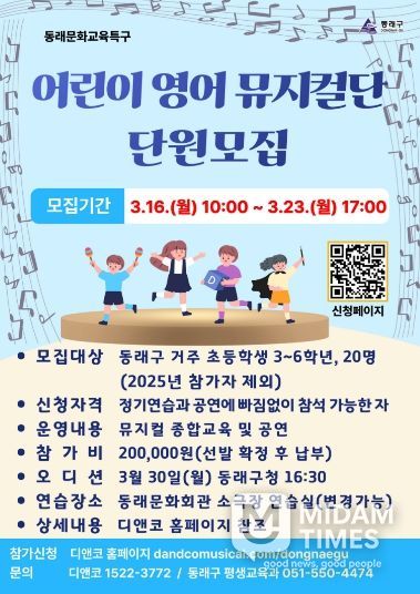 동래구 관계자는 “어린이들이 노래와 춤을 통해 자연스럽게 영어를 배우고, 창의력과 자신감을 키울 특별한 기회가 될 것으로 기대한다”라고 말했다.