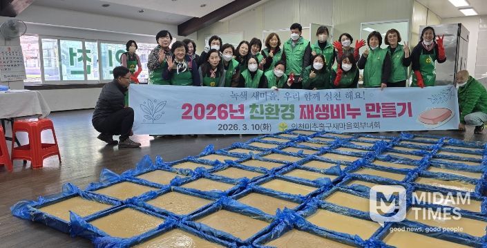 미담타임스 김준완 기자 | 인천 미추홀구새마을부녀회(회장 강화옥)는 지난 10일 미추홀구새마을회관에서 환경 보호와 이웃 사랑 실천을 위한 ‘친환경 재생비누 만들기’ 행사를 개최했다.