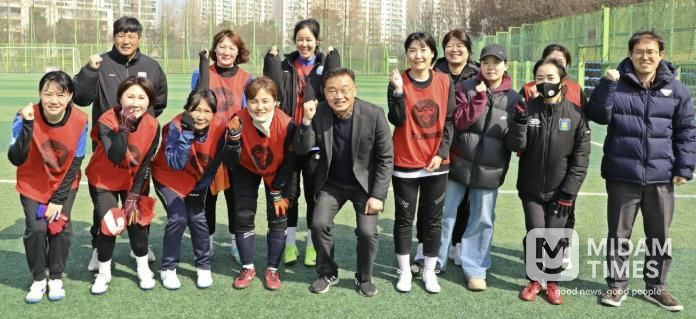 미담타임스 정주환 기자 | 황규돈 팔달구청장은 지난 10일, 팔달구 여성축구단 훈련 현장을 방문하여 선수들을 격려하고 소통을 위한 간담회 시간을 가졌다. 이번 방문은 여성들의 축구 종목 진입 장벽을 낮추는 한편, 올 한 해 모든 선수가 부상 없이 안전하게 훈련에 임하며 마음껏 기량을 펼치길 기원하는 취지에서 마련됐다.