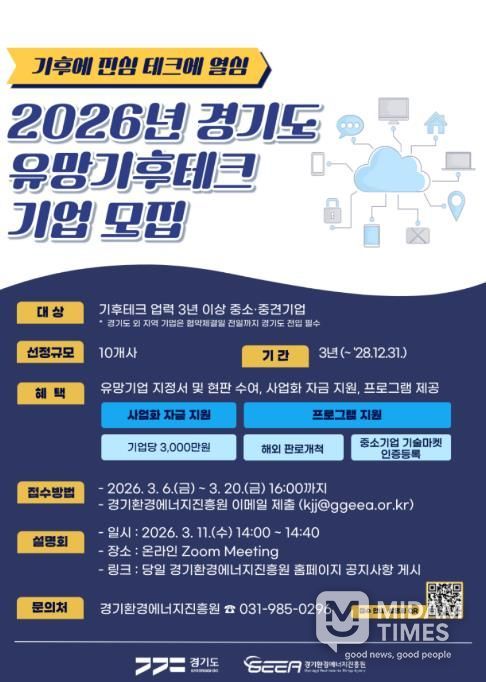 미담타임스 정주환 기자 | 경기도와 경기환경에너지진흥원이 기후위기 대응을 선도할 혁신 기술 보유 기업을 발굴하기 위해 오는 3월 20일까지 ‘2026년 경기도 유망 기후테크 기업’ 10곳을 모집한다.