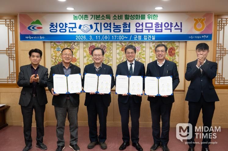 군은 지난 11일 군청에서 김돈곤 군수를 비롯해 김성훈 청양농협 조합장, 황인국 정산농협 조합장, 김종욱 화성농협 조합장, 최진엽 농협 청양군지부장 등이 참석한 가운데 ‘농어촌 기본소득 소비 활성화를 위한 업무협약(MOU)’을 체결했다고 밝혔다.