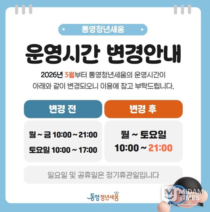 미담타임스 황명수 기자 | 통영시 청년센터(청년세움)는 청년들의 자유로운 소통과 역량 강화를 위해 2026년 3월부터 운영 시간을 대폭 확대하고 야간 이용 환경을 개선했다고 12일 밝혔다.