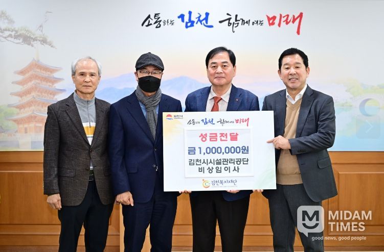미담타임스 김준완 기자 | 김천시는 지난 11일, 김천시시설관리공단(이사장 김재광)의 강국원·김영조·변성철 비상임이사 3인으로부터 성금 100만 원을 전달받았다고 밝혔다.