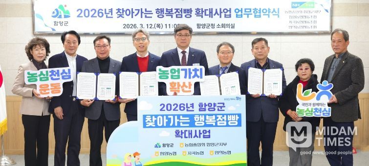 미담타임스 황명수 기자 | 함양군은 12일 군청 소회의실에서 농협중앙회 함양군지부, 함양·지곡·안의농협과 ‘찾아가는 행복점빵 확대사업’ 추진을 위한 업무협약을 체결했다.
