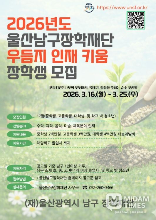 미담타임스 김준완 기자 | (재)울산광역시남구장학재단은 재능과 잠재력을 가진 청소년을 발굴해 남구를 대표하는 인재로 성장시키기 위한 ‘2026년 우듬지 인재 키움 사업’ 장학생을 모집한다.