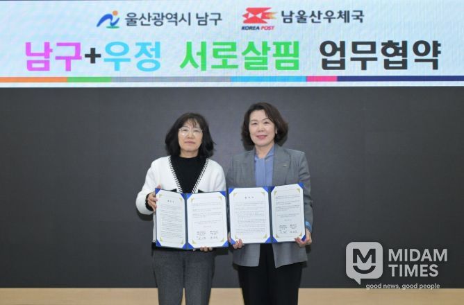미담타임스 김준완 기자 | 울산 남구는 12일 구청 3층 소회의실에서 사회적 고립과 위기가구 증가에 대응하고 고독사를 예방하기 위해 남울산우체국과 ‘남구+우정 서로살핌’ 업무협약을 체결했다.