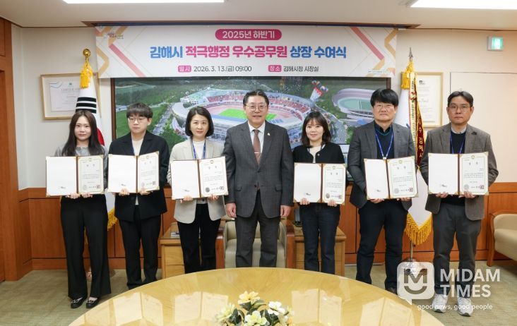 미담타임스 황명수 기자 | 김해시는 시민 체감도가 높은 2025년 하반기 적극행정 우수사례를 선정하고 이를 추진한 우수공무원 7명을 선발해 시상했다고 13일 밝혔다.
