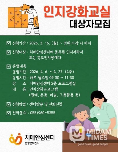 미담타임스 황명수 기자 | 함양군보건소 치매안심센터는 치매 고위험군을 대상으로 ‘2026년 인지강화교실 프로그램’ 참여자를 모집한다고 밝혔다.