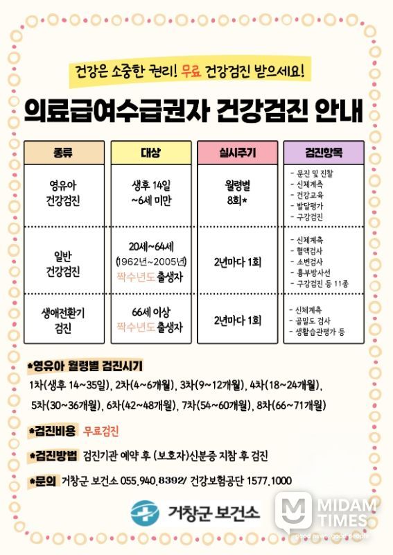 미담타임스 황명수 기자 | 거창군은 의료급여수급권자의 건강증진과 질병 예방을 위해 2026년도 건강검진 비용을 연중 지원한다.