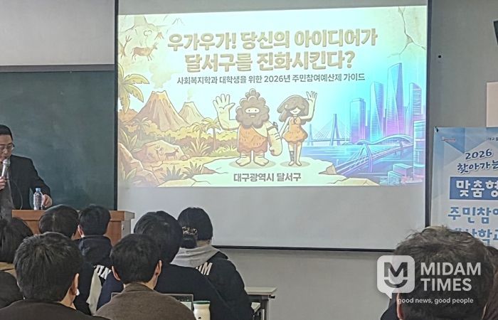 미담타임스 전해찬 기자 | 대구 달서구는 11일 계명대학교에서 청년들의 참신한 아이디어를 구정에 반영하고 참여를 확대하기 위해‘찾아가는 청년 맞춤형 주민참여예산 교육’을 실시했다.
