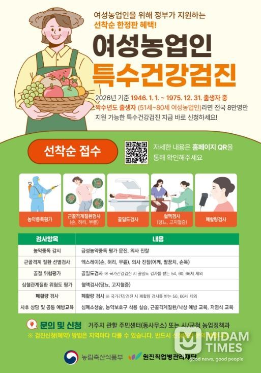 여성농업인 특수건강검진 대상자는 431명으로 사업비 소진 시까지 선착순으로 수시 모집한다.