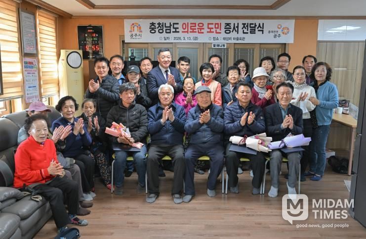 미담타임스 정인화 기자 | 공주시는 지난 13일 정안면 태성리 마을회관에서 공동체 안전을 위해 헌신적인 행동을 보인 시민 3명에게 ‘충청남도 의로운 도민 증서’를 전달했다.