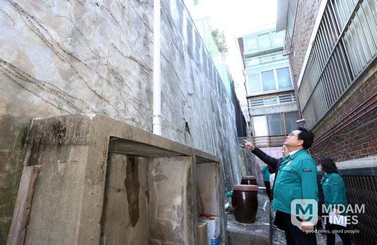 박 구청장은 13일, 사당4동과 상도1동을 방문해 노후 석축·옹벽과 노후 축대·경사면 등의 손상 여부와 안전 상태를 점검했다.