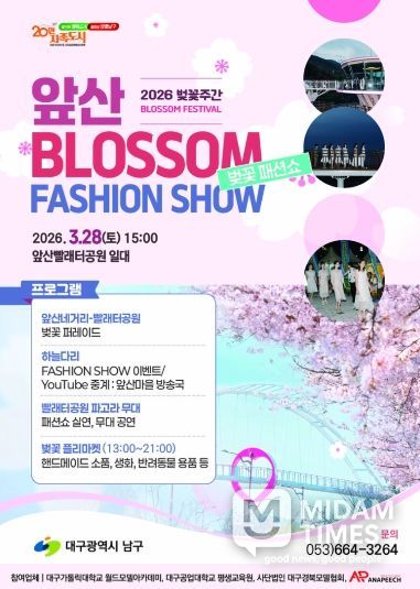 미담타임스 전해찬 기자 | 대구 남구는 오는 3월 28일 지역의 대표 관광명소인 앞산빨래터공원에서 벚꽃패션쇼 이벤트를 개최한다고 밝혔다.