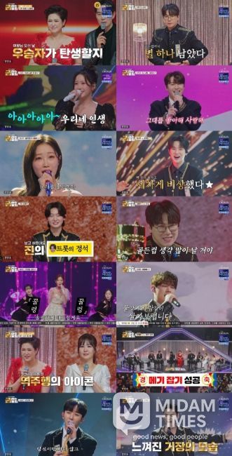 이날 방송의 최대 승부처는 진(眞) 김용빈과 황금별 1위 춘길의 맞대결이었다. 김용빈은 최숙자의 '개나리 처녀'를 구성진 정통 트롯 창법으로 소화하며 감탄을 자아냈다. 미(美) 천록담은 "트롯을 잘 몰랐을 때 용빈이를 보면서 많이 배웠다. 오늘도 역시 김용빈만이 할 수 있는 무대를 보여줬다"라고 감탄했다. 춘길은 김용임의 '사랑님'을 애교 넘치는 무대 매너와 함께 완벽하게 소화하며 분위기를 달궜다. 멤버들조차 고득점을 예상할 만큼 탁월한 곡 소화력을 보여줬지만, 결국 95점에 그치며 고배를 마셨다. 승리한 김용빈은 여섯 번째 황금별을 획득하며 춘길과 공동 선두에 올라섰다.