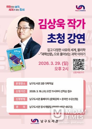 미담타임스 남혜영 기자 | 부산 남구는 오는 3월 29일 오후 2시 남구도서관에서 '김상욱의 과학 공부', '떨림과 울림', '과학산문' 등의 저자인 김상욱 교수를 초청해 작가 강연회를 개최한다고 밝혔다.