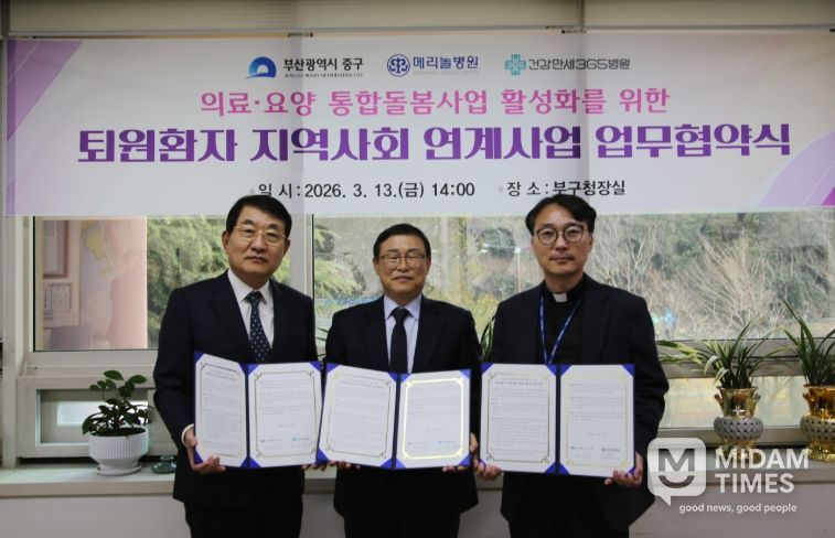 미담타임스 남혜영 기자 | 부산 중구는 지난 13일 의료·요양 통합돌봄사업 본격 시행을 앞두고 지역 의료기관(메리놀병원, 건강만세365병원)과'퇴원환자 지역사회 연계사업 업무협약'을 체결했다.
