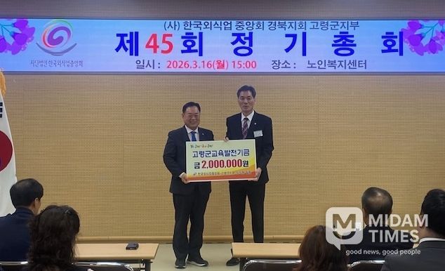 미담타임스 김준완 기자 | 3월 16일 고령군 노인복지센터 강당에서 개최된 ‘사)한국외식업중앙회 경북지회 고령군지부 제45회 정기총회’에서 고령군지부 임직원은 지역의 교육 발전과 인재 양성을 위해 사용해 달라며 교육발전기금 200만원을 기탁했다.