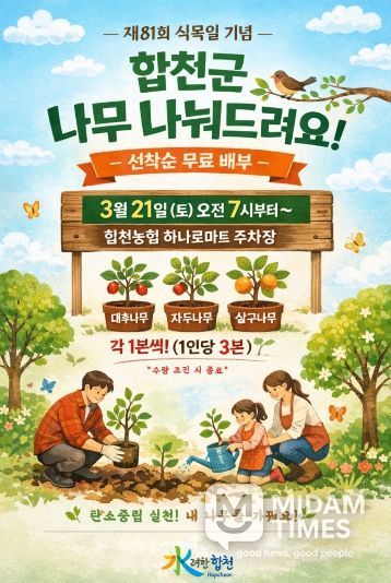 미담타임스 황명수 기자 | 합천군은 제81회 식목일을 기념해 나무와 숲의 중요성을 알리고자 합천군 산림조합과 공동으로 3월 21일 합천농협 하나로마트 주차장에서 2026년 나무 나눠주기 행사를 개최한다.