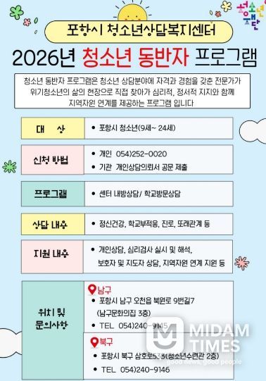 미담타임스 김준완 기자 | 포항시청소년재단 청소년상담복지센터는 고위기 청소년을 대상으로 생활 현장을 직접 찾아가 지원하는 ‘2026년 청소년동반자 프로그램’을 연중 운영한다.