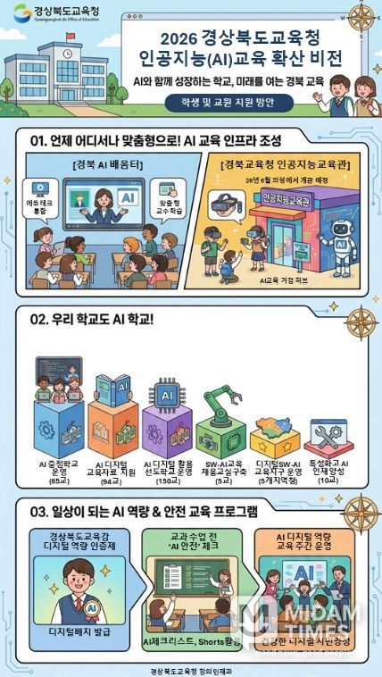 미담타임스 김준완 기자 | 경북교육청은 ‘AI와 동행하는 따뜻한 경북교육’을 비전으로 다가오는 인공지능 시대를 주도할 미래 인재 양성을 위해 ‘2026 AI(인공지능)교육 종합계획’을 수립해 본격 추진한다고 18일 밝혔다.