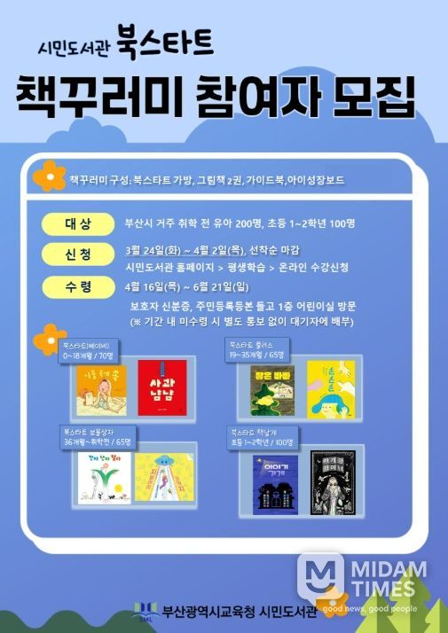 미담타임스 남혜영 기자 | 부산시교육청 시민도서관은 4월 15일부터 6월 21일까지 부산 시내 취학 전 영·유아 및 초등학생 300명, 중학생 100명을 대상으로 2026년 북스타트 책꾸러미 배부 사업을 실시한다.