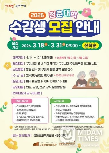 미담타임스 김준완 기자 | 구미시강동문화복지회관은 3월 18일부터 3월 31일까지 ‘청춘대학’ 수강생을 모집한다.