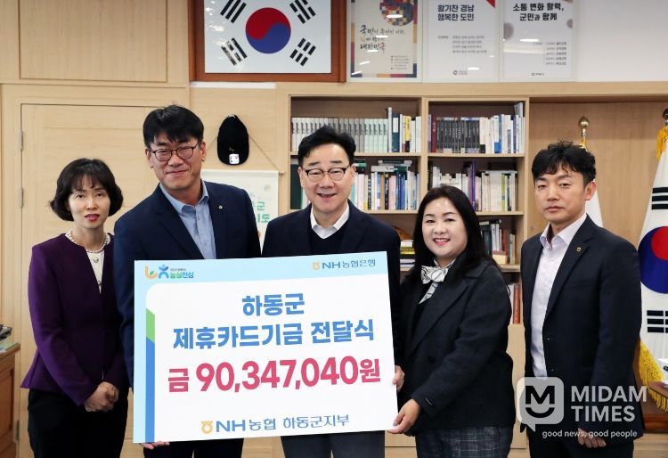 미담타임스 황명수 기자 | 하동군은 지난 17일 NH농협은행 하동군지부(지부장 장주익)로부터 제휴카드 사용에 따른 적립 기금 9035만 원을 전달받았다고 밝혔다.