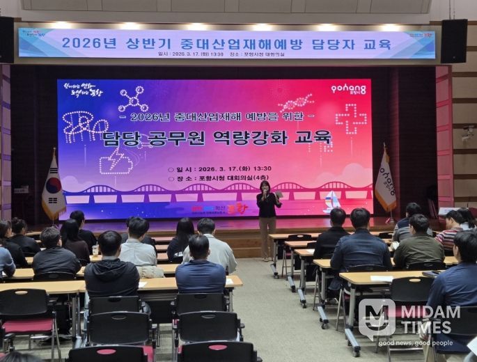 미담타임스 김준완 기자 | 포항시는 지난 17일과 18일 양일간 시청 대회의실에서 현업근로자 관리 및 도급(용역·위탁) 사업을 담당하는 공무원 160명을 대상으로 ‘2026년 중대산업재해 예방 및 안전보건 역량 강화 교육’을 실시했다.