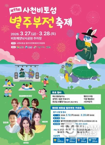 미담타임스 황명수 기자 | 사천시 사천비토섬별주부전축제추진위원회는 '제11회 사천비토섬 별주부전 축제'를 오는 3월 27일부터 3월 28일까지 이틀간 서포면 비토해양낚시공원 일원에서 개최한다고 18일 밝혔다.