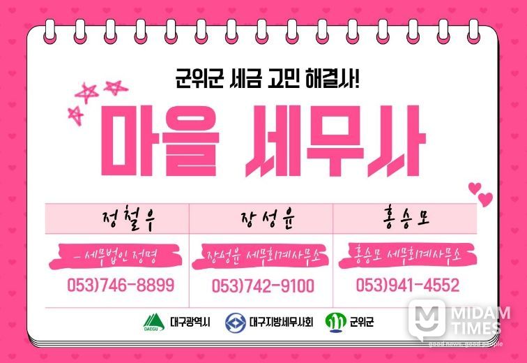 미담타임스 김준완 기자 | 대구시 군위군은 세무 상담이 어려운 영세사업자 등 모든 군민들을 위해 ‘마을세무사 제도’를 운영하며 무료로 세무상담서비스를 제공하고 있다고 밝혔다. 마을세무사 제도는 세무사 이용이 어려운 군민들에게 지역 세무사들의 재능기부를 통해 국세와 지방세 관련 상담을 무료로 제공하는 제도로, 생활 속 세금 고민을 해소하고 납세자의 권익을 보호하기 위해 마련됐다.