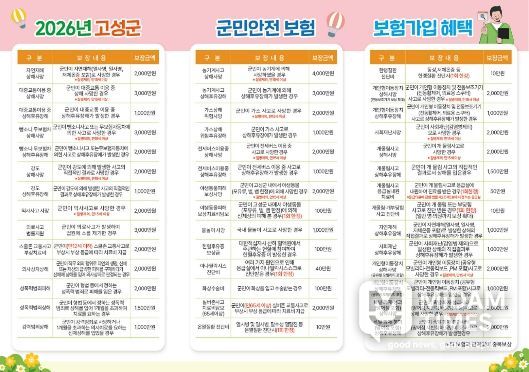 미담타임스 황명수 기자 | 고성군은 일상생활 중 예상치 못한 각종 재난 및 사고 등으로 인해 군민이 피해를 당할 경우, 이를 보장할 수 있도록 전년도 보다 보장 범위를 넓혀 2026년 군민안전보험에 가입했다고 밝혔다.